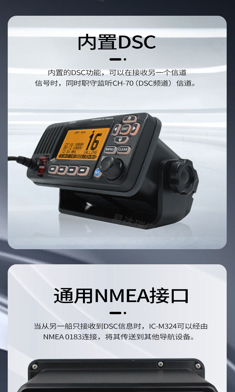 內(nèi)置的DSC功能,即使您正在接收另一個(gè)頻道,DSC功能也可監(jiān)聽(tīng)ch70dsc頻道)信道,dsc功能包括  遇險(xiǎn) 個(gè)人  小組  所有船舶  緊急性 安全性  位置請(qǐng)求/報(bào)告  輪詢(xún)請(qǐng)求和dsc測(cè)試調(diào)用。