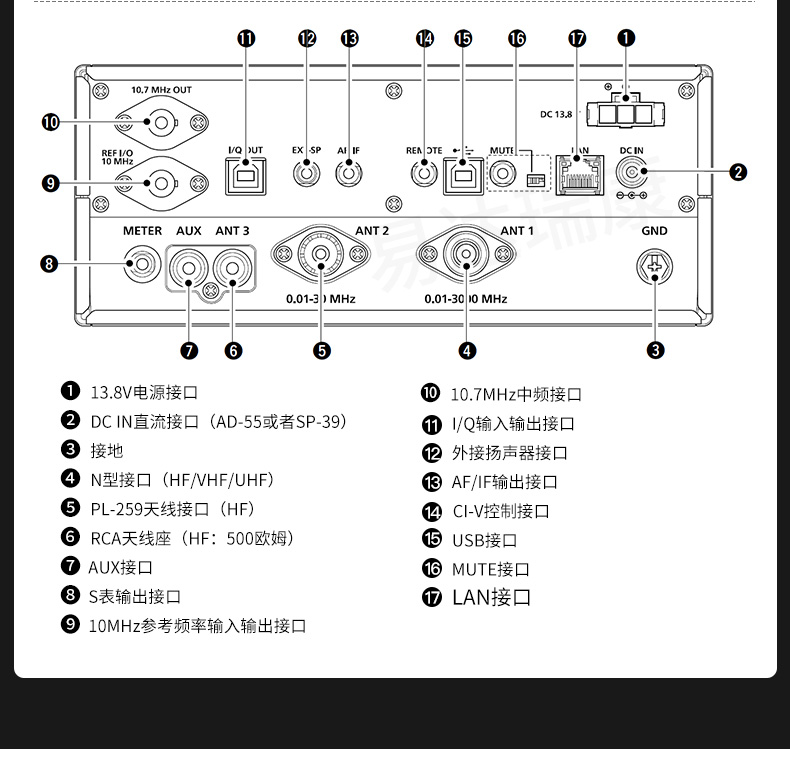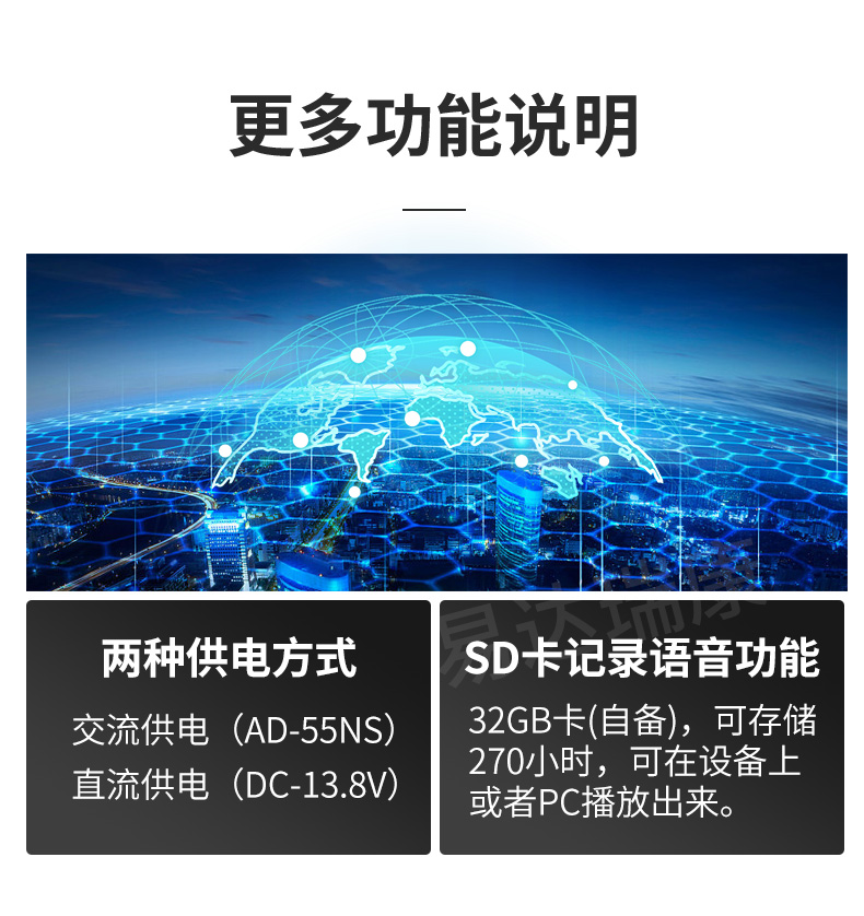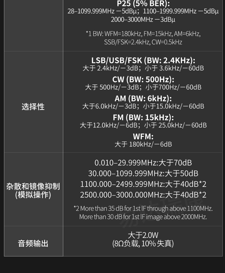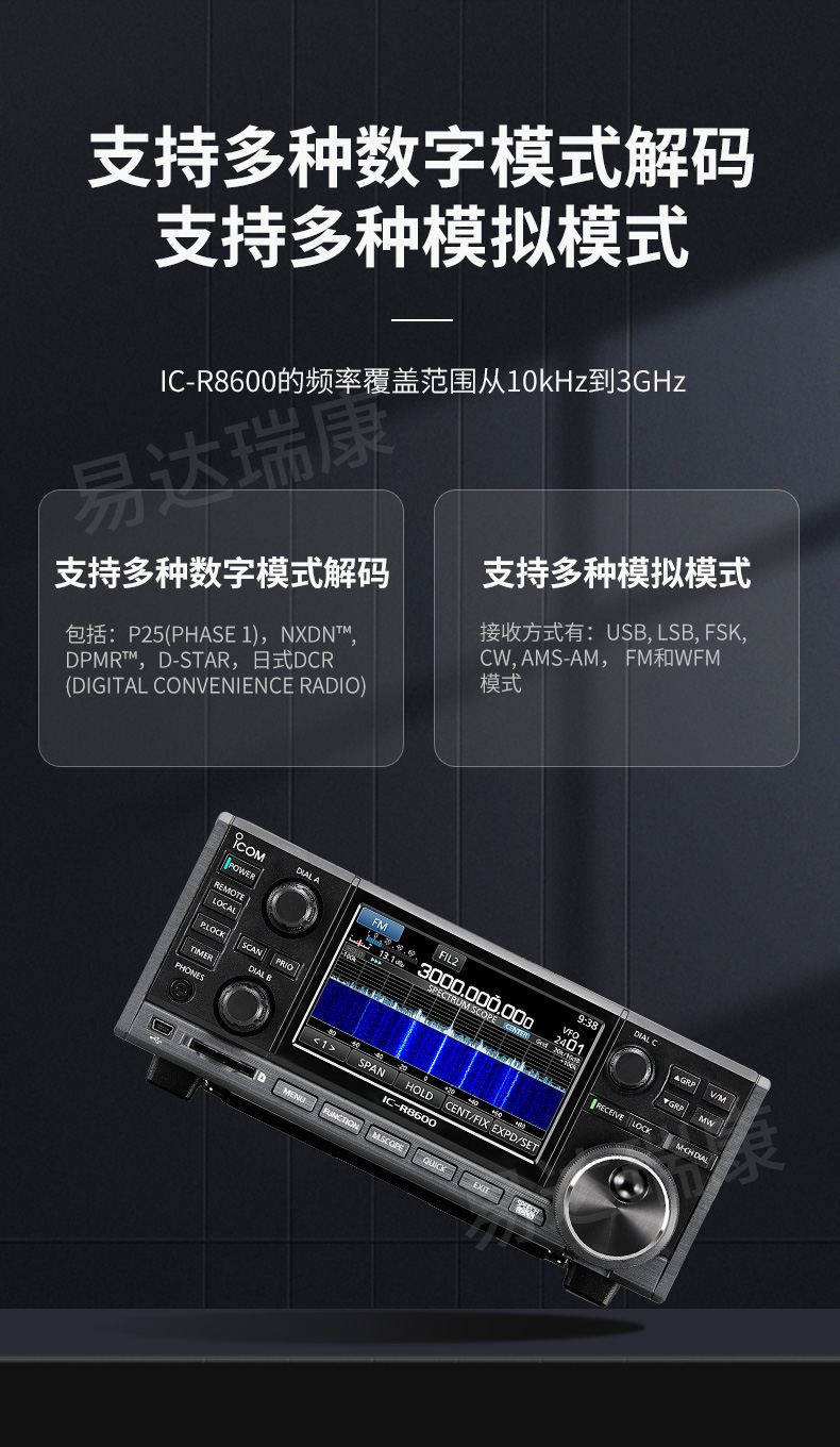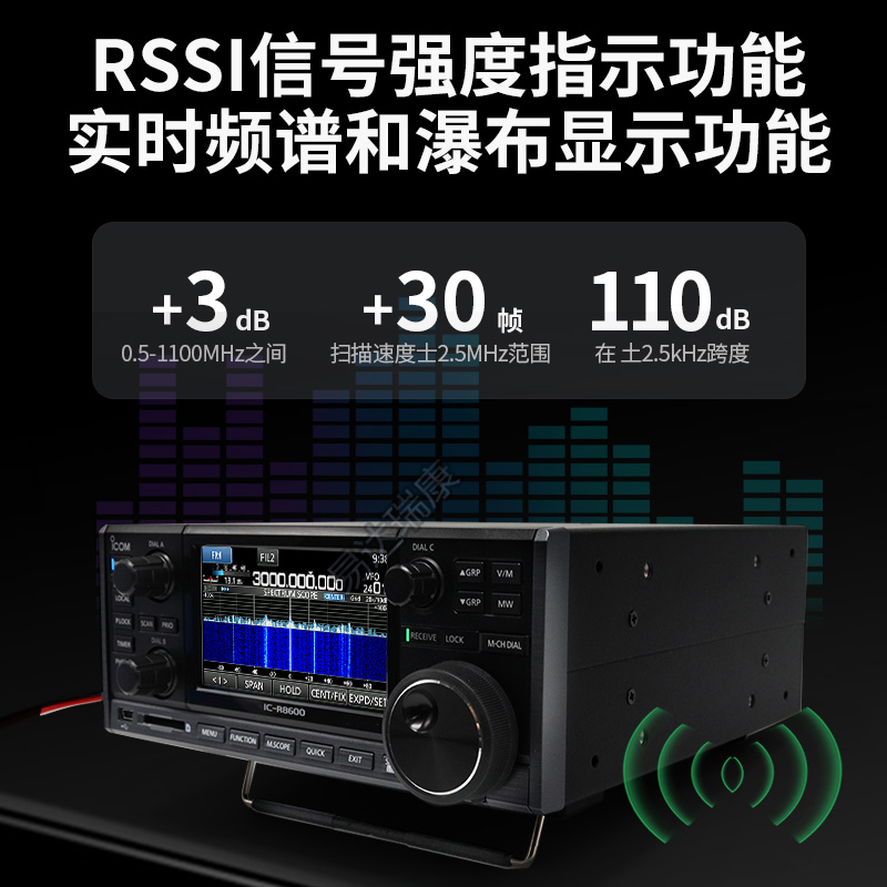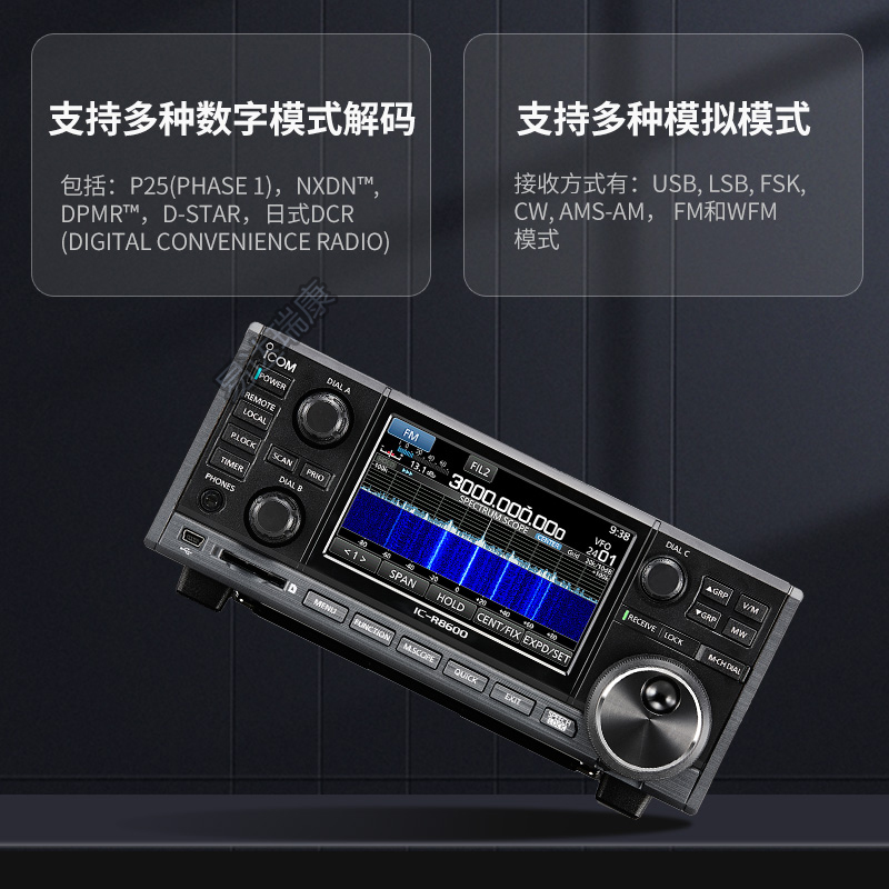 10KHz-3GHz寬頻段接收,4.3英寸彩色觸摸屏。兩種電源接入方式,2個天線端口。支持D-STAR, NXDN,dPMR,APCO ,P25模式??娠@示接收到信號的強度。