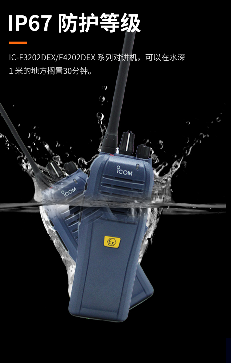 IC-F3202DEX/F4202DEX 系列對講機,可以在水深1 米的地方擱置30分鐘。