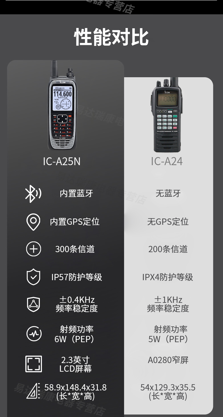 IC-A25N內(nèi)置GPS和藍(lán)牙,VOR導(dǎo)航功能可以幫助您修正航線,以免出現(xiàn)偏差。 IC-A25N/A25C航空對講機(jī)有2.3英寸液晶顯示屏,智能電量顯示可實(shí)時檢測電池狀態(tài),IP57防護(hù)等級防止灰塵進(jìn)入,1米水下放置30分鐘核準(zhǔn)代碼:CMIIT ID:2018HJ0692