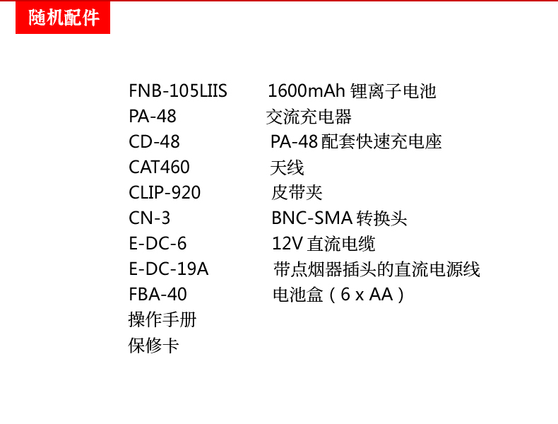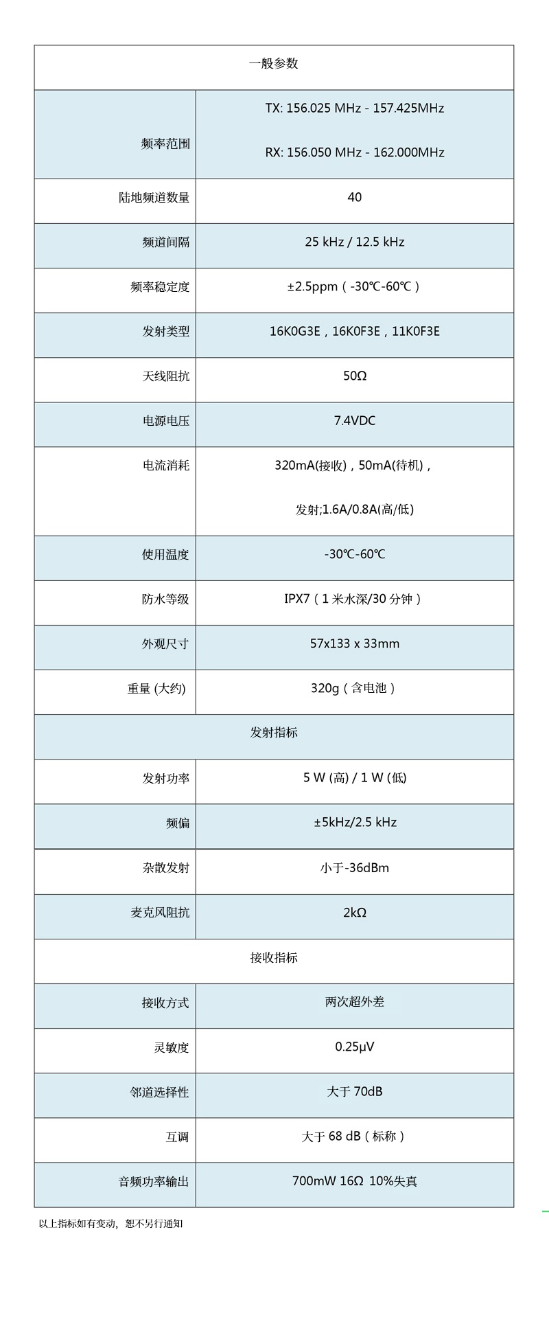 - 40個(gè)可編程陸地通信頻道 - 1600mAh 大容量鋰電池,交流快速充電器 - 5W/1W 輸出功率 - IPX7 防水等級(jí)(1.0米水深30分鐘不進(jìn)水) - 700mW 大音量?jī)?nèi)置揚(yáng)聲器 - 按鍵大,屏幕大