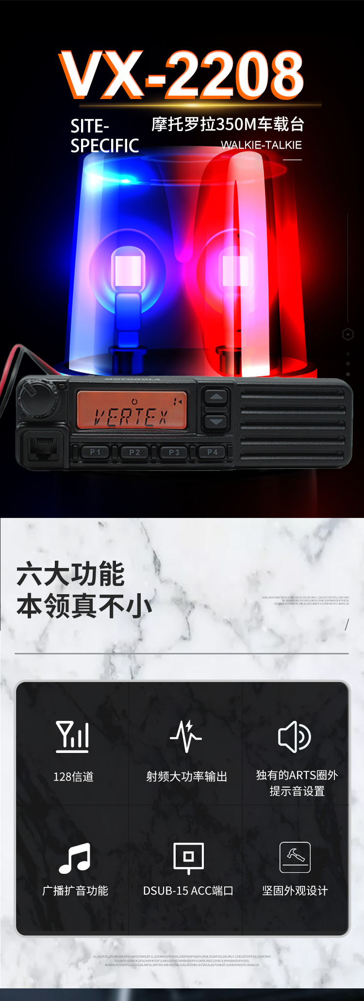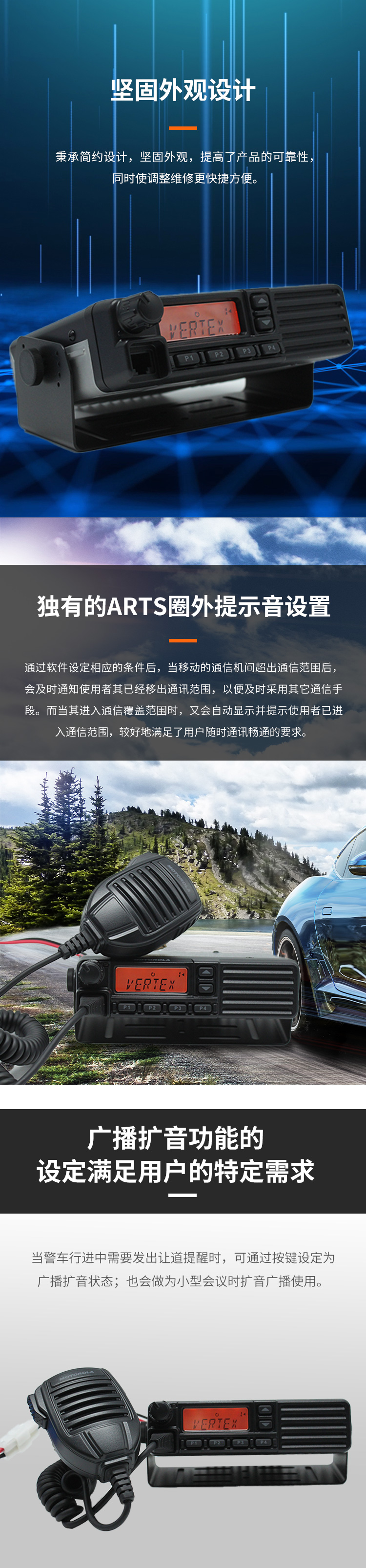 128個(gè)信道,25W高功率輸出,寬頻帶350-390MHz,遠(yuǎn)程停用、啟用功能。緊急報(bào)ARTS圈外提示功能,超出通訊范圍會發(fā)出提示,語音加密功能(可選)。
