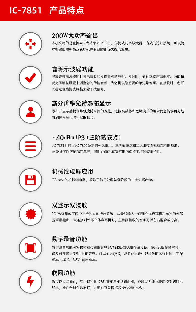 特有冷卻風扇,保證200W大功率輸出。 液晶觸摸功能,顯示的頻譜可以進行放大。 屏幕雙顯示接收頻率和發(fā)射頻率 可錄制接收和發(fā)射信息。 具有網(wǎng)絡(luò)功能,遠程操作電臺。