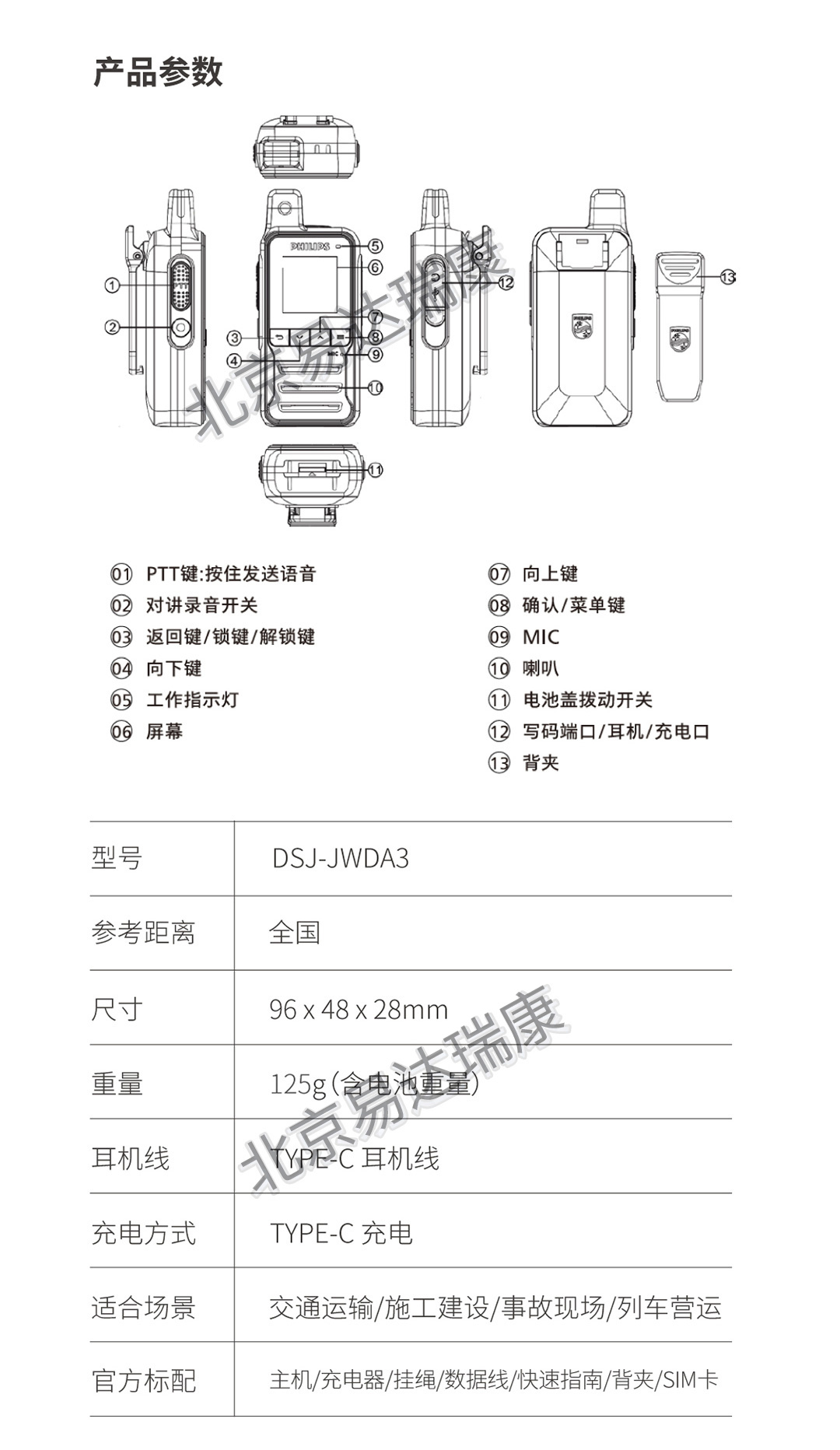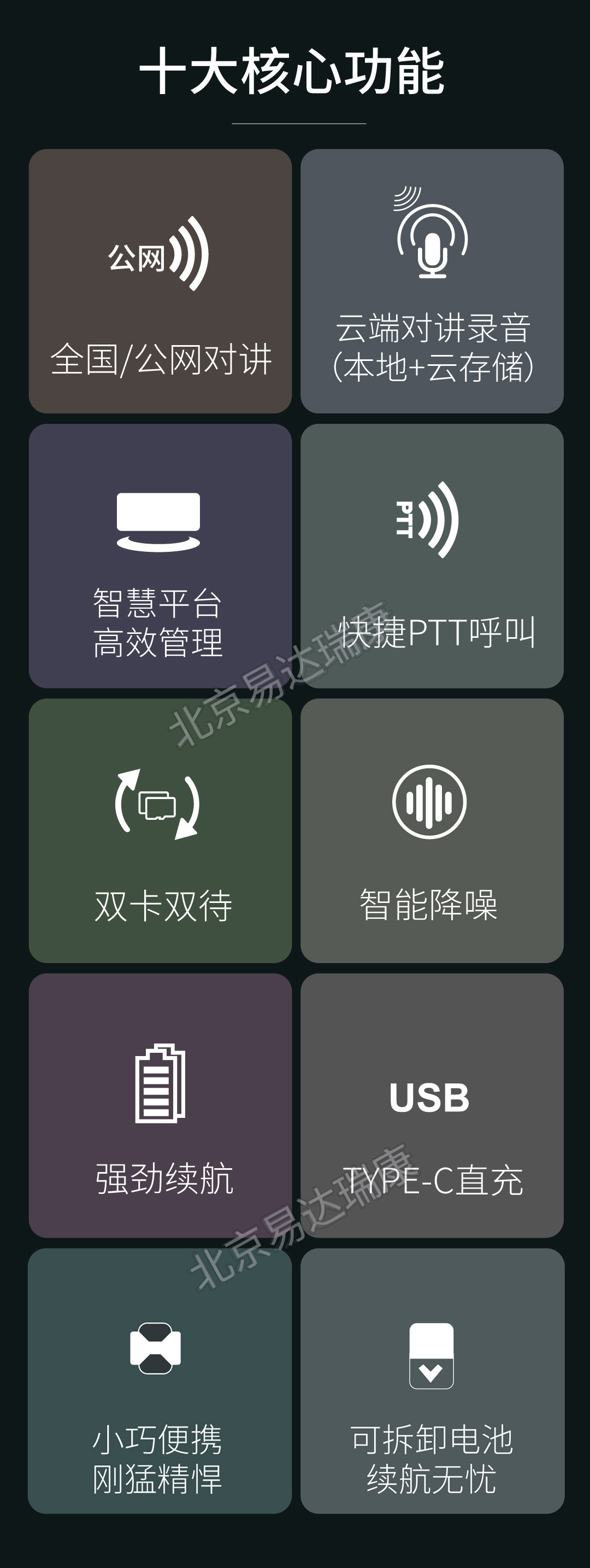 雙卡雙待/全國/公網(wǎng)對講/云端錄音/智慧平臺高效管理/快捷PTT呼叫/強勁續(xù)航/TYPE-C直充/可拆卸電池/