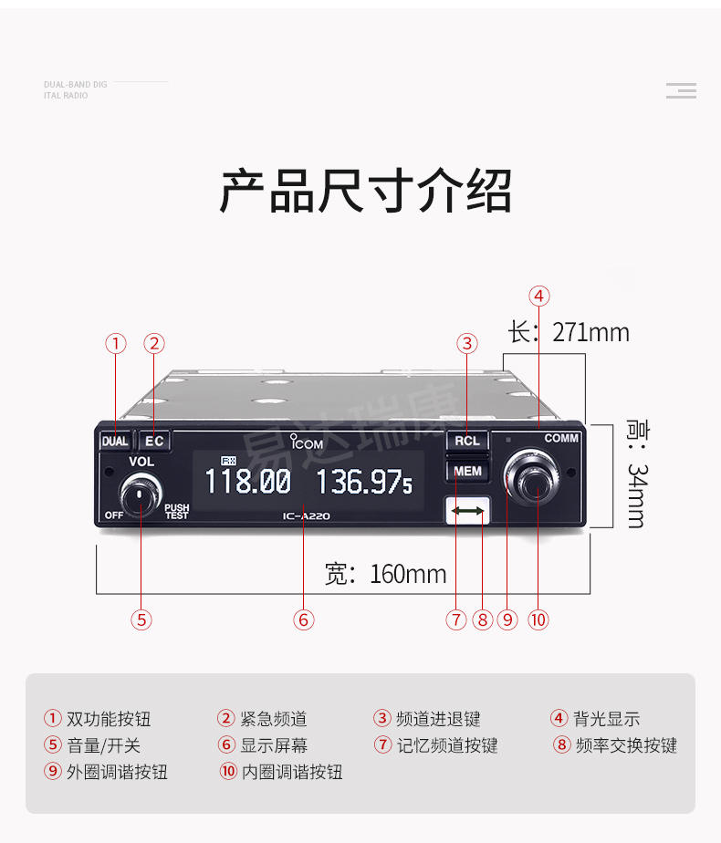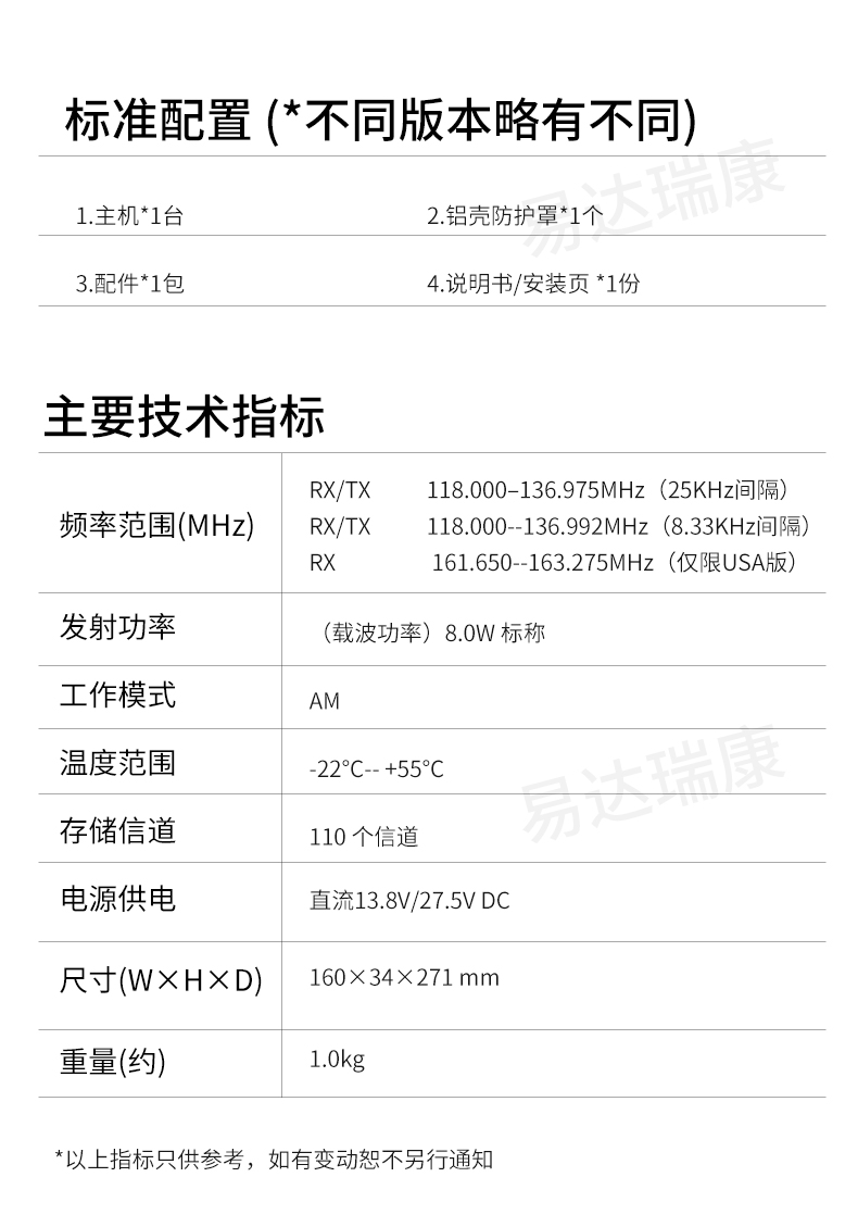• 50個記憶信道,ANL自動降低噪音功能,一鍵121.5MHz信道。