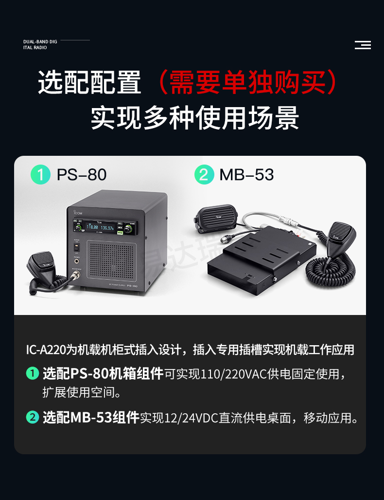 白光字符顯示,ANL自動降噪,兼容12V/24V DC供電,遠程控制。MB-53和PS-80兩種安裝方式,適用不同使用場所??焖倩氐綒v史使用信道。