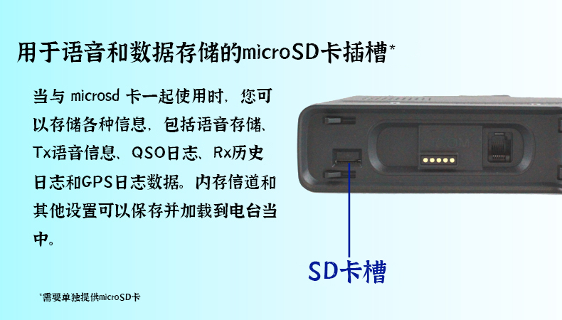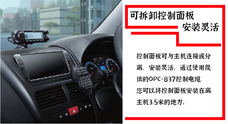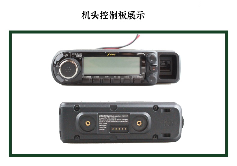 寬帶接收,U/V雙段發(fā)射,數(shù)模業(yè)余電臺(tái),LCD 4色背光顯示和按鍵背光,內(nèi)置GPS接收,控制面板與主機(jī)可分離,可插SD卡用于語(yǔ)音和數(shù)據(jù)的存儲(chǔ),輸出功率50W。