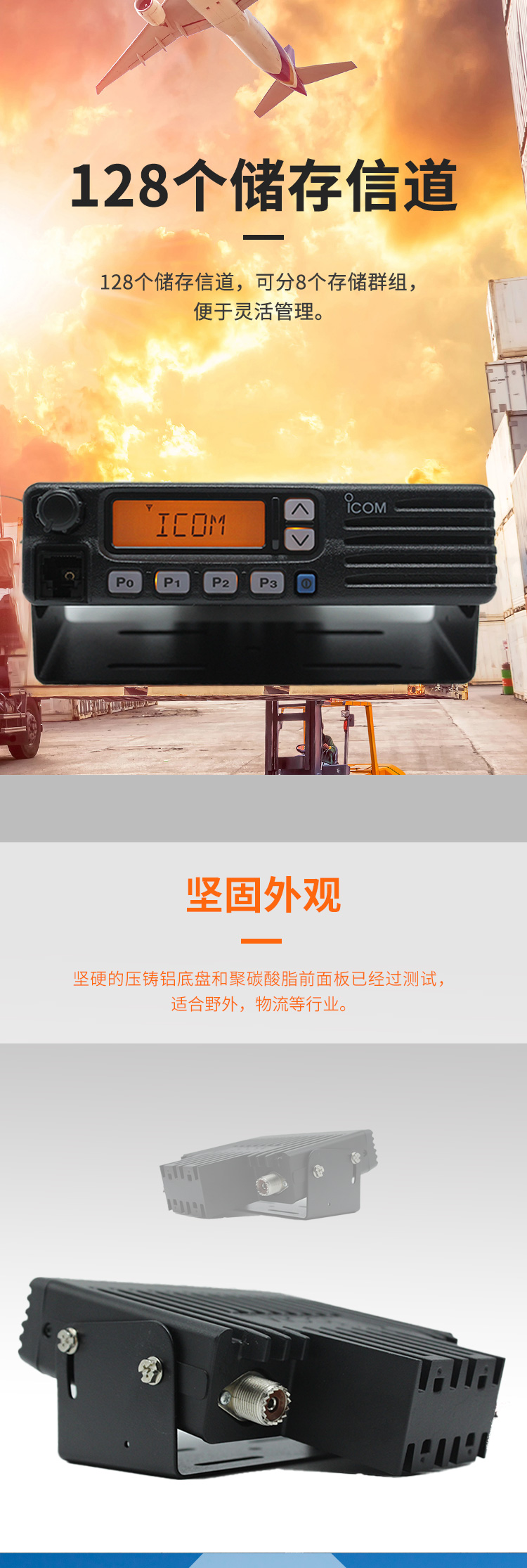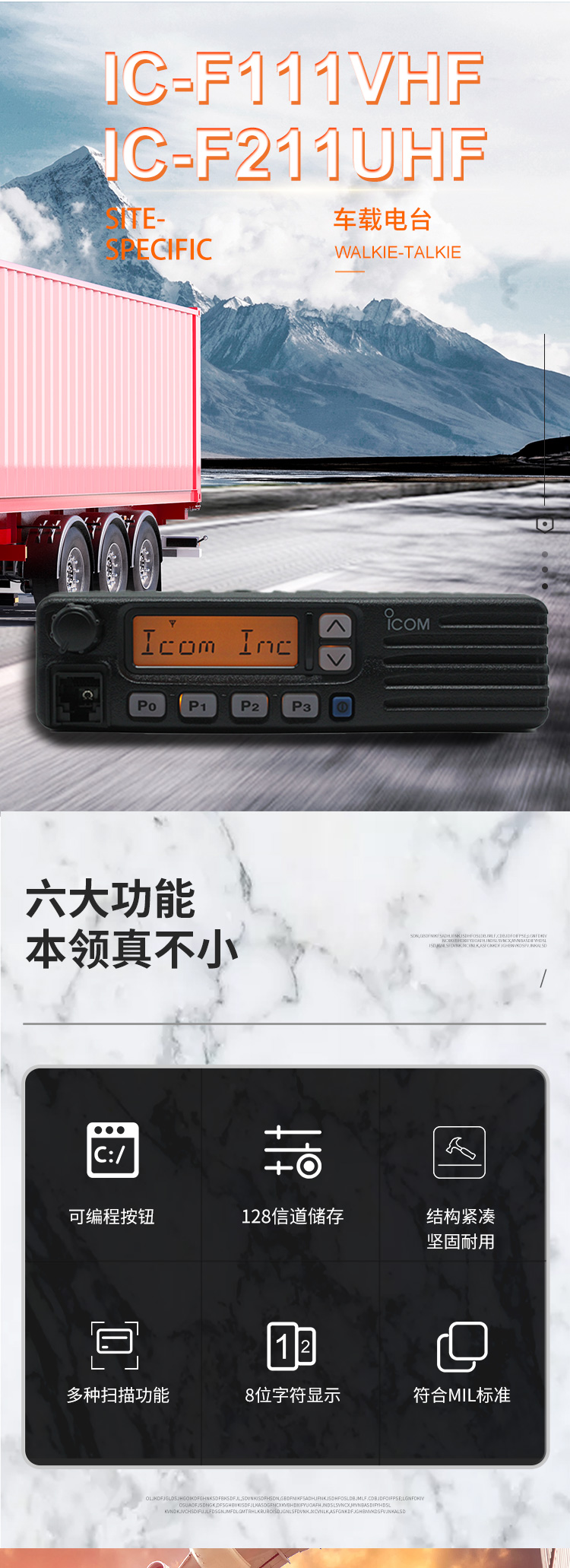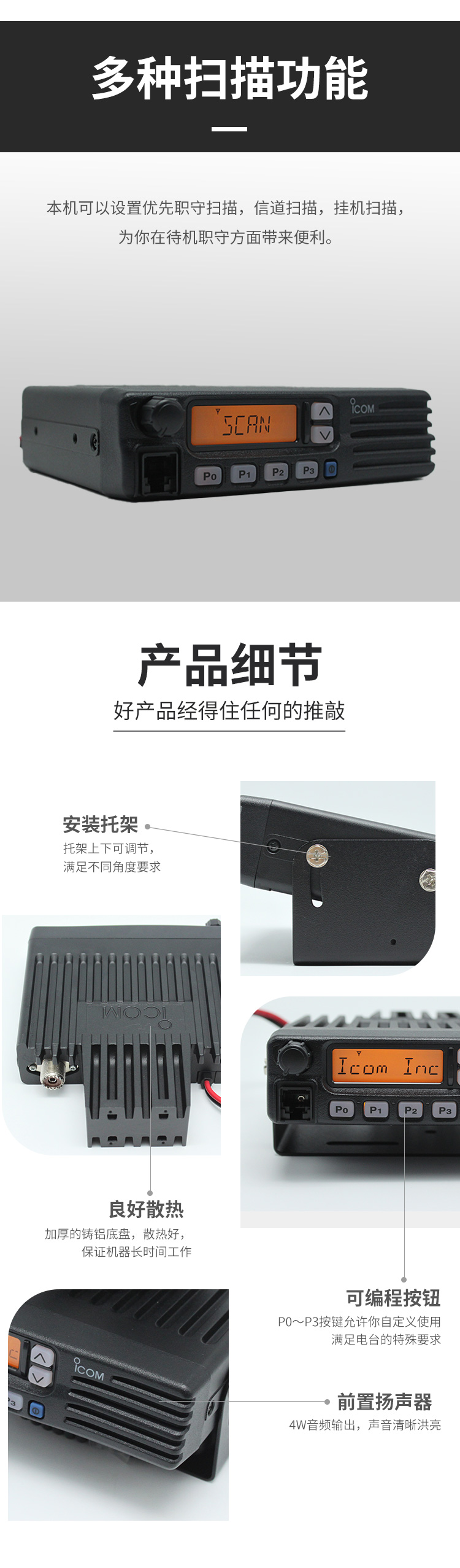 頻率范圍136-174MHz ,128個可編程信道,50W大功率輸出,多種掃描方式和普通/優(yōu)先掃描,密碼開機,鑄鋁底座,有助于散熱。